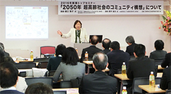 2016年 兵庫県生協連 第11回新春トップセミナーに、2050研究会委員の樋口恵子氏(NPO法人高齢社会をよくする女性の会理事長)と、当研究所の藤井晴夫研究員の二人が招かれ、記念講演「『2050年超高齢社会のコミュニティ構想』について ― 行政と生協への期待 ―」を行いました。兵庫県からは知事をはじめ多くの方にご参加いただき、また生協からも41人が参加され、盛りあがったセミナーになりました。