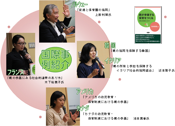 子ども・子育て関連三法が2015年度から本格実施となる。この新制度は、利用者ニーズをより実現しやすい仕組みを取り入れてはいるものの、利用者である子どもや親のニーズが、それぞれの現場でどの程度具体化されるか、その道筋は必ずしも明確ではないと考えられる。新制度には消費税から1兆円超の財源が確保されるはずであったが、そのうち7000億しか見込めずそれも不確かである。保育士不足も指摘されるなかで、どうやって「よりよい子どもの育ちと子育て」を実現するのか、各国の労働事情や保育の質の確保、利用者の参画がどのように保障されているのか、その具体的な政策と保育・労働の制度について日本と比較して考える機会にした。
