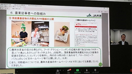- JA共済連の川村晃司氏より「新型コロナウイルス感染拡大にともなう地域貢献活動の取組みについて」のテーマで地域貢献活動への新型コロナウイルス感染拡大にともなう影響、医療機関・介護施設へのサージカルマスク寄贈、外出自粛者へ向けた健康増進体操動画の公開、小学校などへの交通安全DVD寄贈、国産農産物の消費拡大PR動画の公開等の取組み等が報告された。