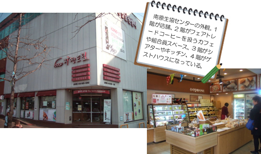 21日は南原生協センターを訪問し、組合員によるこれまでの活動について説明を受けたり、店舗を視察(買い物も)した。南原生協センターは2011年6月にオープンした(インストアベーカリーもある)店舗とカフェや組合員活動スペース(宿泊施設もある)の入った施設である。1400名余りの組合員がおり、95%が女性、30代から40代の年齢層が中心という。南原市は経済の30%が農業であり、住民の収入はそれほど高くないとのことであるが、組合員は中間層からやや高収入の層が多いそう。組合員の平均的な購入額は月あたり200~210米ドルとのことで、かなり高い印象を受けた。カフェにはフルタイムのスタッフはおらず、活動もかなりの部分を「アクティブ・メンバー」と呼ばれる組合員ボランティアが担っているそうである。私たちが施設を訪問した際もいくつものグループが食の安全に関する勉強会を開いていた。