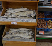 リスボンの宿から地下鉄、船、30分おきの3両編成の郊外電車を乗り継いで1時間半弱でバニェイラ駅に到着。無人駅だが駅は綺麗に新装され、エレベーターも備え付けられていた。そこから数分で狭い一方通行の通りに赤い看板の小さな入口の店があった。3階建ての建物の1階である。ただ、入っていくと思ったよりも奥行きがあって3筋の道に分かれ、奥にはガラスケースのある肉類の対面販売コーナーがある。そのそばの広くない空間には4人掛けの簡易テーブルとイスがあり、老人たちが元気にお話し中である。中筋は非食料品を扱っている。左手前には魚販売のコーナーがあるが、まだ午前のせいか、ポルトガル名物の丸物の魚介は並んでいなかった。コープ商品は皆無である。ただ、値段は他のスーパーに比べても安めに思える。ただ、これは郊外という地域性なのか。プロモもある。