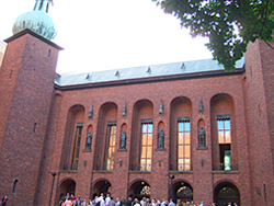 6月28日に学会が始まり、同日夜にスウェーデン市庁舎で市長主催の歓迎レセプションがありました。同市庁舎は毎年ノーベル賞授賞式の行われる建物だそうで、祝賀パーティの開かれる「黄金の間」にも入ることができました。部屋は確かに金色に輝く壁で覆われており、とても広いのと天井が高いのに驚きました。ノーベル賞の授賞式は12月にありますが、この広い空間をどうやって暖めているのだろうかと思いました。