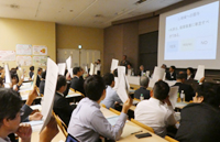 パネルディスカッションでは、日本大学の岡田太准教授を座長に「地域社会のくらしをめぐる課題と共済の関わり」「共済への期待と課題」を討論テーマとして設定しました。登壇したパネリストからの問題意識の報告や意見交換を行うとともに、岡田座長から研究集会の参加者(聴講者)に「共済は積極的に地域に関わっていると思うか」「共済の地域社会づくりは、現在の社会貢献活動で十分だと思うか」などの質問を行い、参加者がどのように考えているかを回答していただきました。地域生協の参加者から子育て支援や中高年層の学びの場づくりなどの取り組みを共済も関わって進めているという活動の報告をしていただいたり、研究者の方から共済が生協の福祉事業や医療生協とも連携していくことを期待するという発言をいただいたり、参加者全体で一緒にテーマを考えていくことができたのではないかと考えます。