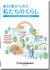 日本生協連と生協総研との共同研究である全国生計費調査は、事前にご登録いただく生協組合員モニター制度を1996年に開始し、今年で19年になります。組合員登録モニターは、1月から12月まで毎月一回、収入(給与・年金など)・消費支出(家賃地代・食費・教育費など)・非消費支出(社会保険料・税金など)など、家計簿に記帳した内容を提出します。このたび、2014年の12ヶ月連続提出者の集計結果と、その分析をまとめた「家計簿からみた私たちのくらし」が発行されました。2014年は、46生協1,416世帯の数字を集計しました。