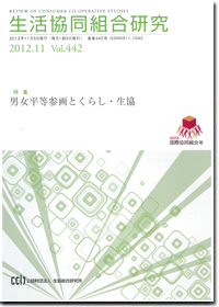 今号の特集は,都市部の女性の働き方にようやく変化がみえてきたこと,価値観も変化していることを契機に,幅広い視点から論考をいただいた。都市部については,三浦展著『東京は郊外から消えていく!』(2012年)によれば,企業戦士と専業主婦の夫婦の好んだ「郊外の一戸建てで子育て」というモデルはもはや少数派だという。首都圏の人口動態が細かい年代別地域別のデータ分析で予測されているが,夫婦共働きがしやすい便利な場所,つまり保育所や買い物のアクセスにあまり時間がかからない地域に人口が集まってきているという。『日本経済新聞』(2012年10月22日)では「共働き世帯が主流に」というタイトルで共働き世帯の割合が過去最高の55.3%になったと紹介している。特に団塊ジュニア世代以降で子育て期も夫婦で働く傾向は現れてきたようだ。このような現代的な潮流から,団塊世代とそれ以降10年くらいの男性が事業組織のリーダー層である生協の文化そのものが,どうやら古びてみえる。
