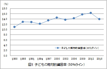 中央値とは所得順に対象を一列に並べた真ん中の額で、平均値ではない。1人あたり年間所得の真ん中が仮に200万円であるなら100万円が貧困ラインになる。そのライン以下の日本の子どもの貧困率(厚生労働省:国民生活基礎調査より算出)を掲示する。