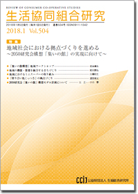 今月号は当研究所で開催している第2次2050研究会の研究中間報告である。第2次2050研究会は2016年度より(第1次)2050研究会の提言である「集いの館」構想を受け、その構想を新たな社会システムとしてデザインし実行プロセスを具現化することと、2050年の地域生協のミッション・ビジョンを提言することのふたつを目的として研究を続けている。今回は主に「集いの館」構想の具現化に向けた研究成果を報告する。