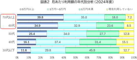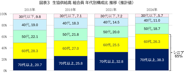 2024年度全国生協組合員意識調査によれば、生協組合員の構成比は60代以上のシニアが過半を占める(図表1)。またシニアほど生協の利用金額も高い傾向が見られ(図表2)、結果として供給高に占めるシニアの購買シェアは約65%に達していると推計される(図表3)。