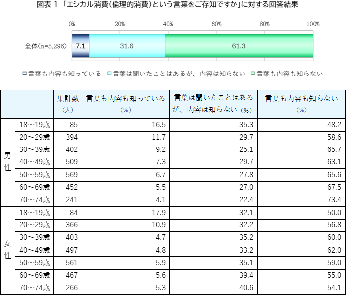 エシカル消費は生協によっても非常に重要な概念であるが、この言葉の認知度は一向に向上していないことが様々な調査から指摘されている。生協総合研究所でも直近の2025年3月に、18歳から74歳までの男女を対象としたエシカル消費に関する独自調査を実施しているが、エシカル消費について「言葉も内容も知っている」と回答した割合は7.1%と極めて低い(図表1参照)。