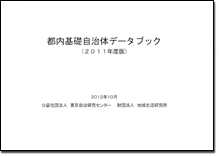 『都内基礎自治体データブック(2011年度版)』が完成しました。 このデータブックは、東京都内で「まちづくり」の活動を行おうとするときに前提とする基礎的なデータを提供しようという狙いから作成されたものです。対象とした自治体は、東京特別区と多摩地域の市です。