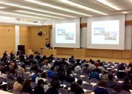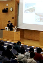 開講初日の8日は約100人の受講者がありました。初めに担当教官の経済学部、中村年春教授からこの講座の目的と受講上の注意について説明がありました。中村教授は初の試みとしてスタートしたこの講座に積極的に参加してほしいと呼び掛けました。
