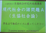 生協総合研究所が昨年実施した知の市場「生協社会論」が、8日大東文化大で開講しました。今年度は、大東文化大学の全学共通科目「現代社会の諸問題A」の中の一講座として開講されます。大学の正式カリキュラムですが、他大学の学生、一般の方など学外からの参加も認められています。