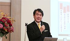 これからの高齢社会は、①高齢化する高齢者(増えるのは80歳以上)、②女性高齢者の増加、③1人暮らしの高齢者の増加、④貧しい高齢者の増加、という4つの特徴があり、一方で「社会の支え手」である就業者は2040年までに1,285万人も減少することから、これまでとは全く違う成長モデルを考える必要があると強調されました。最後に、「小さくとも豊かな国」を目指すべきであり、高齢化で変わるマーケットへの対応と「歩いて日常生活が完結できる街づくり」を提起いただきました。